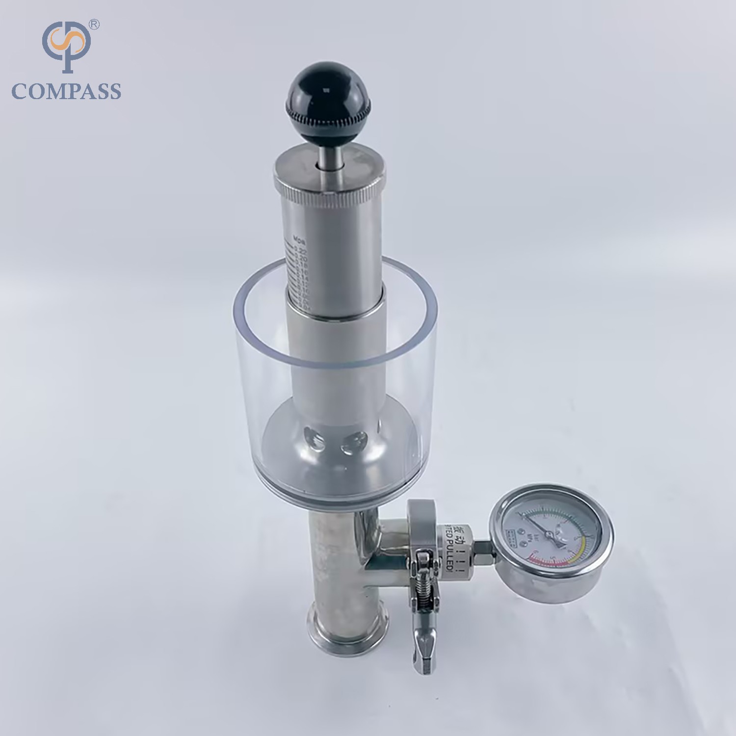 A válvula controla a pressão ajustando a mola. Quando a pressão no tanque é maior que a pressão de ajuste da válvula, a sede da válvula liga automaticamente, a pressão no sistema do equipamento é liberada e a fermentação da cerveja é efetivamente processada. O tanque não está mais em alta pressão, o que pode causar perigo. A pressão pode ser ajustada de acordo com a necessidade do usuário. A válvula possui um copo que pode ser enchido com água. Pode ser visto quando o gás sai. Um manômetro sobressalente pode estar disponível.