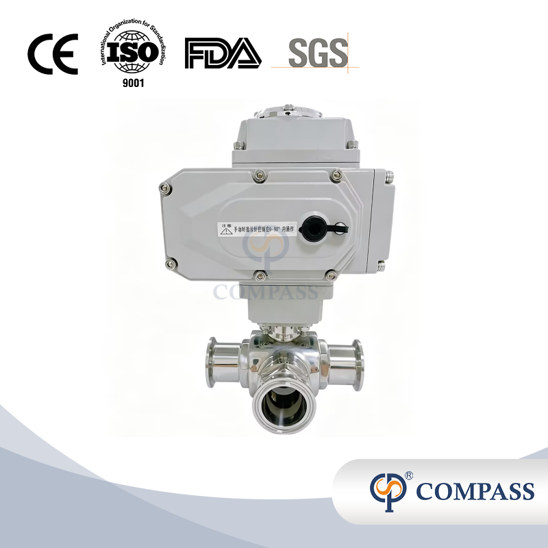 Descrição da mercadoria: Válvula de esfera elétrica sanitária de aço inoxidável mais vendida SS304 Válvulas de esfera de três vias com porta L com braçadeira de 50,8 mm com cabeça elétrica 220